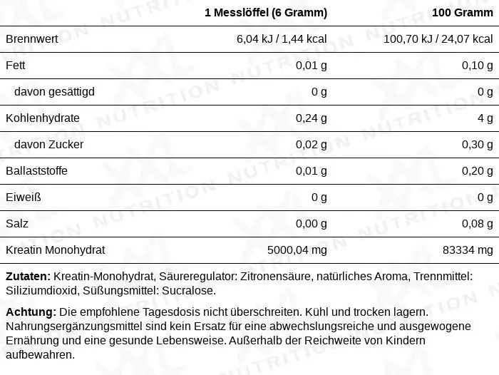 Unser Creatin Monohydrat ist 100 % rein, mikrofein gemahlen und dadurch besonders gut vom Körper aufnehmbar. Es löst sich leicht in einem Getränk deiner Wahl und kommt ohne unnötige Zusatzstoffe aus. Das Kreatin Monohydrat Pulver ist zudem kalorienfrei und für Veganer geeignet.